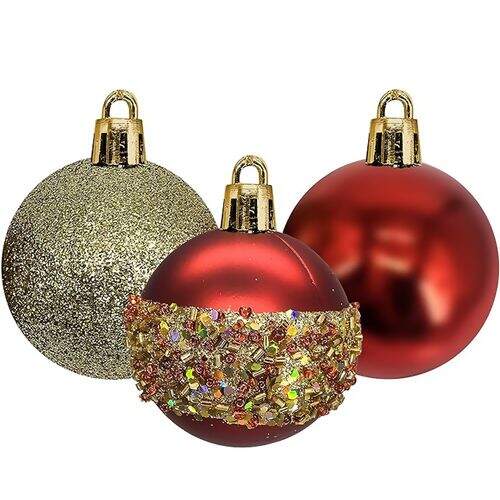 Bola de Natal 50 mm Mista Decorada Vermelho/Dourado Pacote com 12 unidades