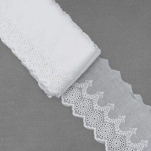 O bordado inglês de algodão é um aviamento decorativo feito de 100% algodão, com 13,70 metros de comprimento.