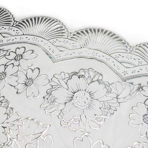 Descrição Caminho de Mesa Plástico Rendado 0,50m Largura - 1 Metro Cor: Silvery Metalizado Prata