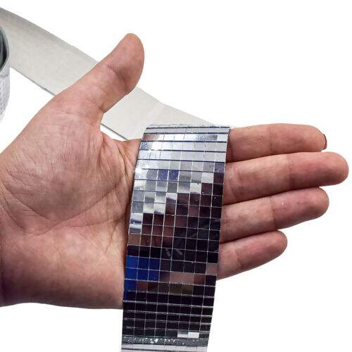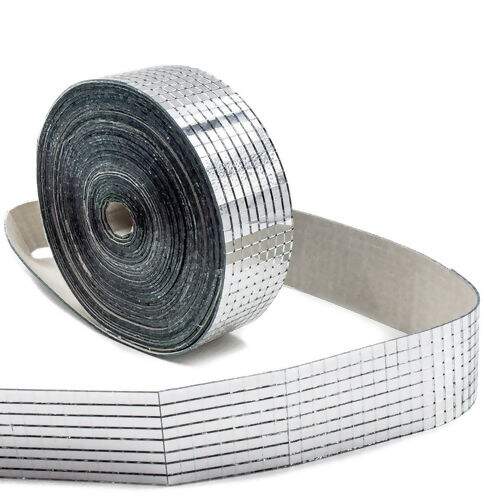 Faixa de Espelho em Vidro Prateado, com uma largura de 4 cm, perfeita para adicionar um toque de elegância e brilho aos seus projetos de artesanato e decoração. Esta faixa de espelho é composta por pequenos espelhos de vidro quadriculados, cada um medindo 5x5 mm, que refletem a luz de maneira encantadora.