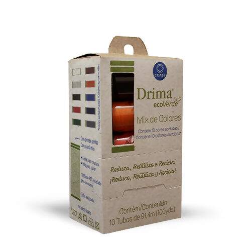 Drima Eco Verde está disponível em uma prática embalagem com 10 tubos de cores sortidas, a 1° linha de costura doméstica 100% Reciclada de garrafa pet do mercado foi criada de maneira revolucionária e ecológica para você.