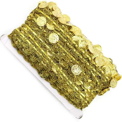 Galão dourado com medalhas para acabamento de peças de decoração, roupas, fantasias etc.