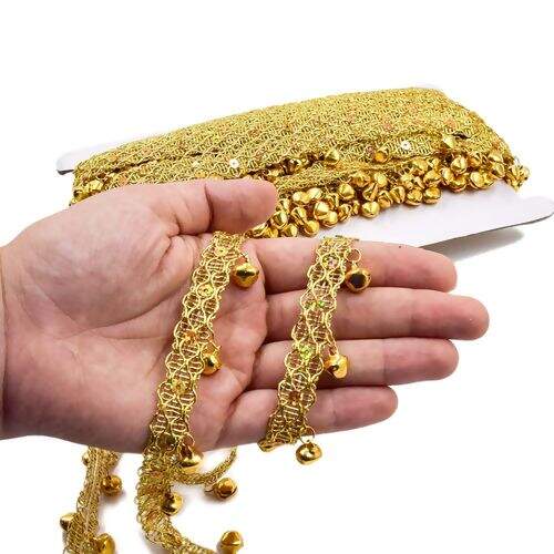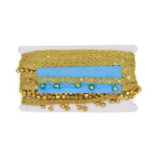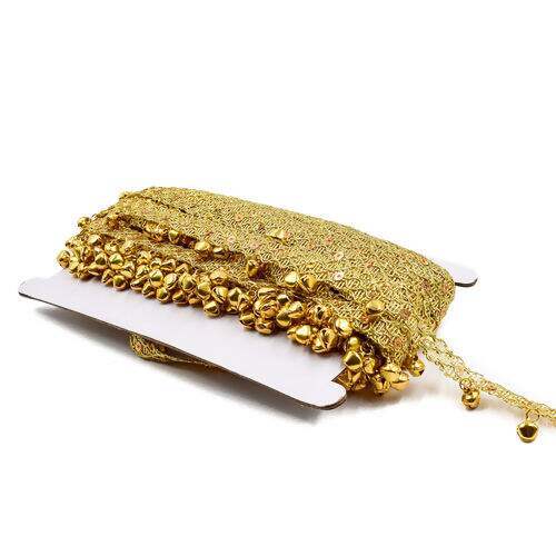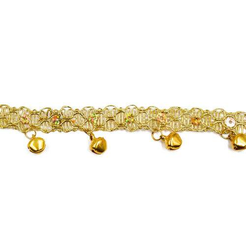 Galão dourado de 3,5 cm de largura com detalhes em lantejoulas e guizos dourados para acabamento de peças de decoração, roupas, fantasias etc.