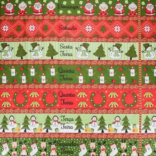 A estampa alegre e festiva de personagens clássicos do Natal, combinada com as faixas que organizam os dias da semana, torna esse tecido perfeito para criações que unem praticidade e beleza em uma só peça. Além disso, sua qualidade em 100% algodão garante uma textura suave e confortável para os projetos.