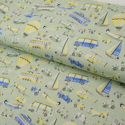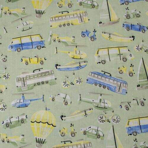 Tecido de Algodão Estampado (Meio Metro) - Transportes Verde Bebê