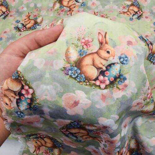 Descrição Tecido de Algodão Estampado (Meio Metro) - Coelhinho da Páscoa Fundo Verde