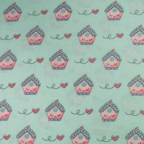 fornecedor_bling Tecido de Algodão Estampado (Meio Metro) - Coleção Animalistic Casinha Fundo Verde