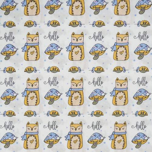 Descrição Tecido de Algodão Estampado (Meio Metro) - Coleção Animalistic Casinha Gatinho com Cogumelo