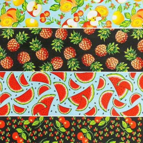 Descrição Tecido de Algodão Estampado (Meio Metro) - Faixas Frutas Fundo Preto
