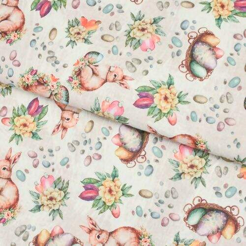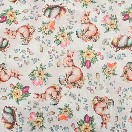 Tecido de Algodão Estampado (Meio Metro) - Páscoa Coelhinhos Fundo Bege