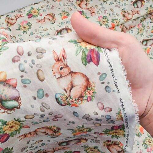 Descrição Tecido de Algodão Estampado (Meio Metro) - Páscoa Coelhinhos Fundo Bege