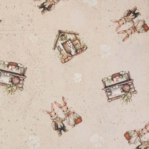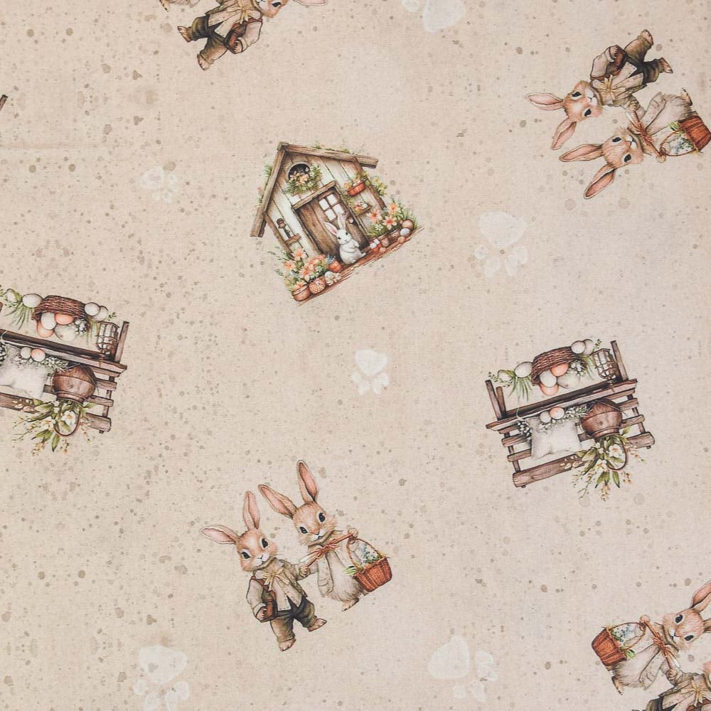Tecido de Algodão Estampado (Meio Metro) - Páscoa Coelhinhos Fundo Bege