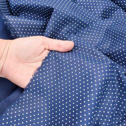 Tecido Estampado em Poá. O avesso do tecido é na cor lisa Azul Marinho.