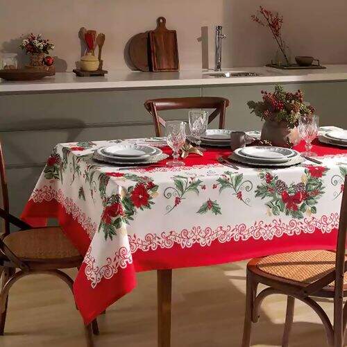 Toalha de mesa para deixar o seu Natal especial e cheio de elegância, em tela de poliéster/algodão de fácil conservação.