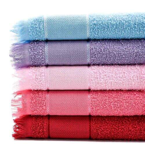 A Toalha Escolar de Felpa possui uma faixa de etamine para fazer lindos bordados e um friso nas extremidades da barra de bordar com fio de rayon.